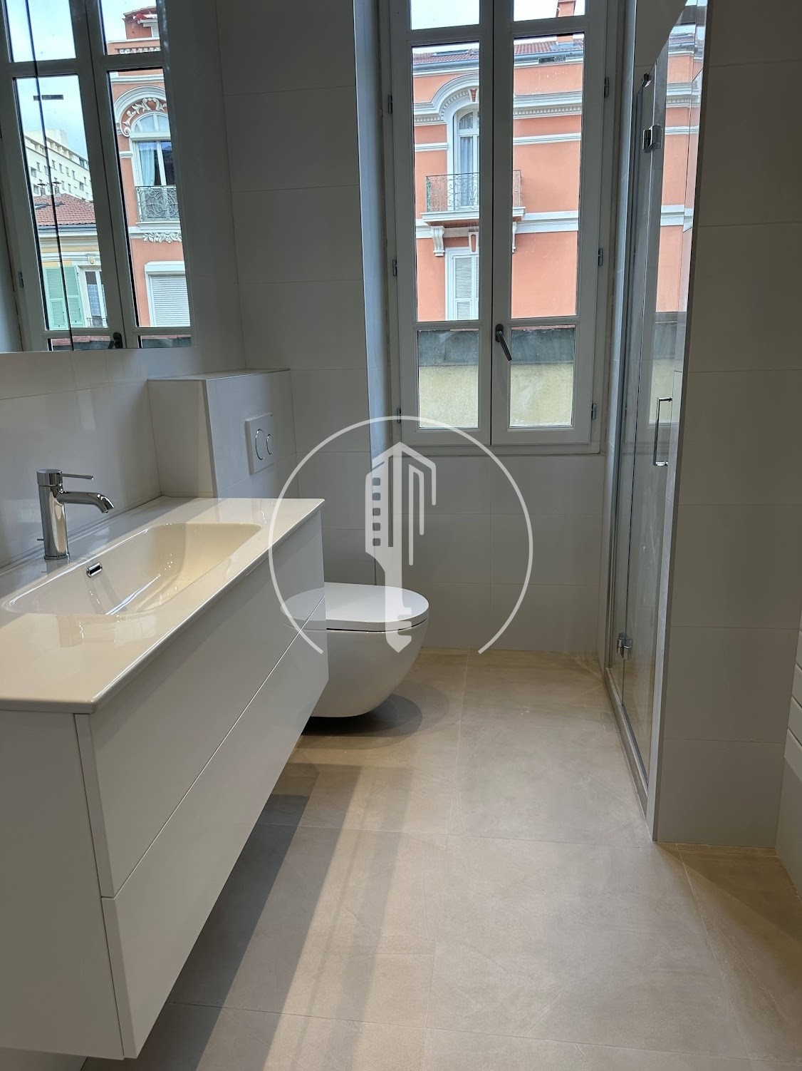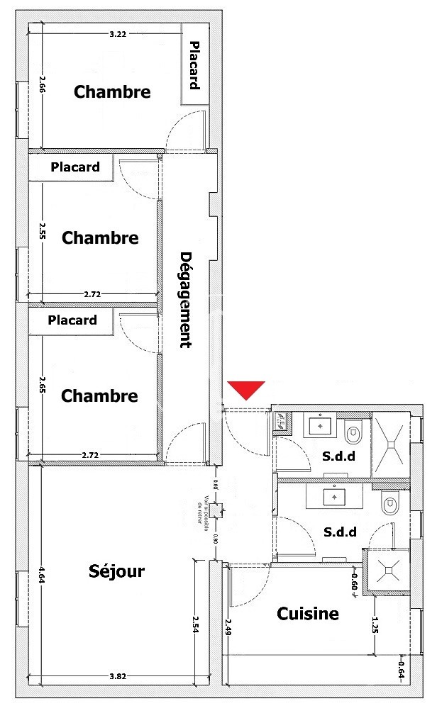 Entrance, living room, corridor, 3 bedrooms with cupboards, 2 shower rooms, equipped kitchen, air conditioning, double glazing