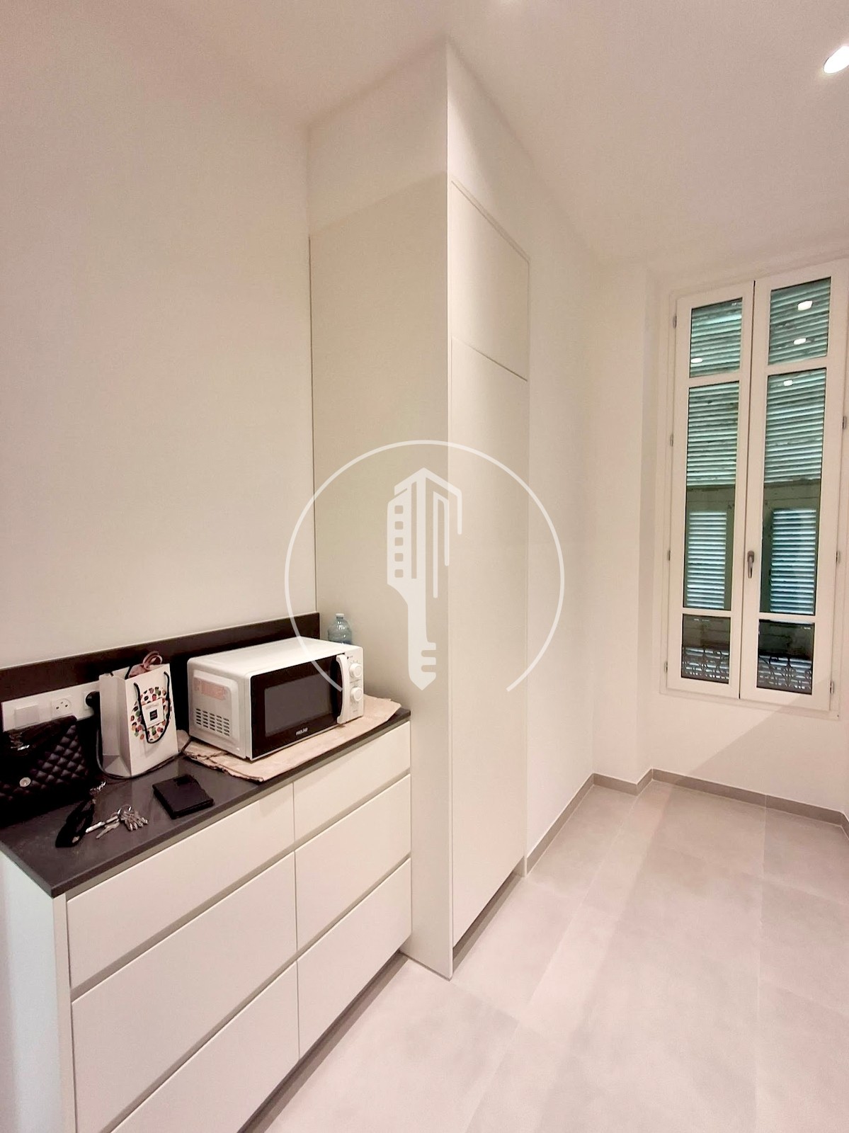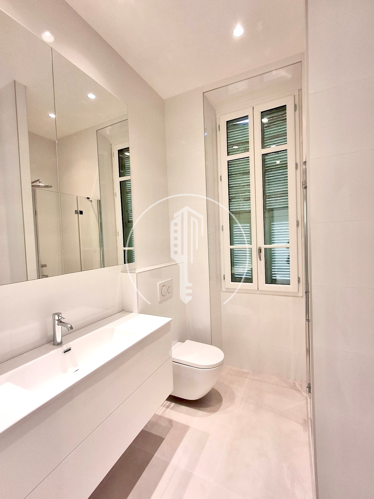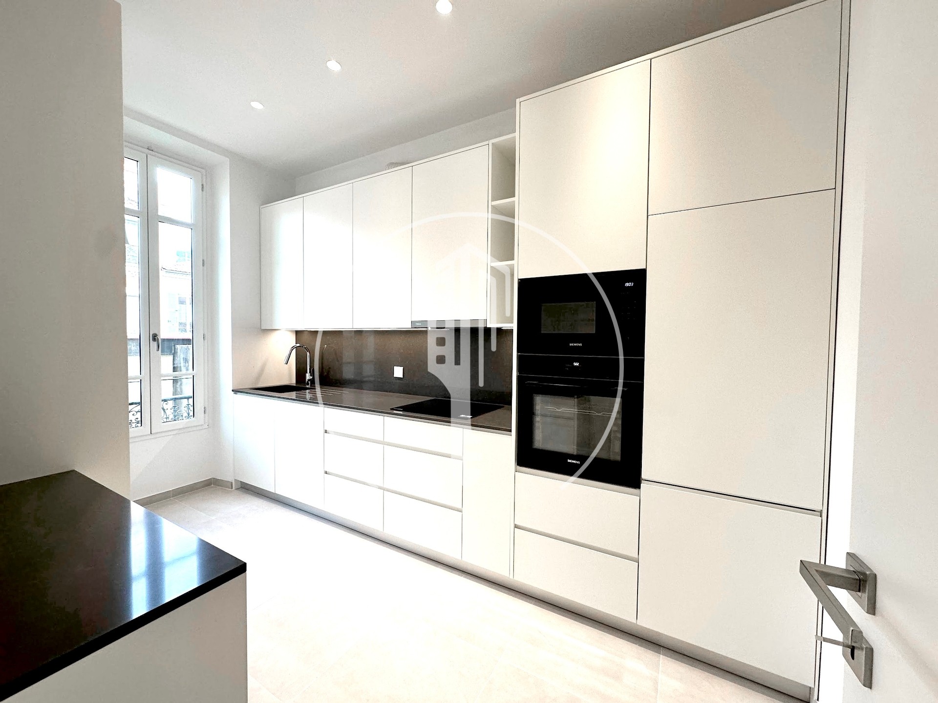 Entrance, living room, corridor, 3 bedrooms with cupboards, 2 shower rooms, equipped kitchen, air conditioning, double glazing
