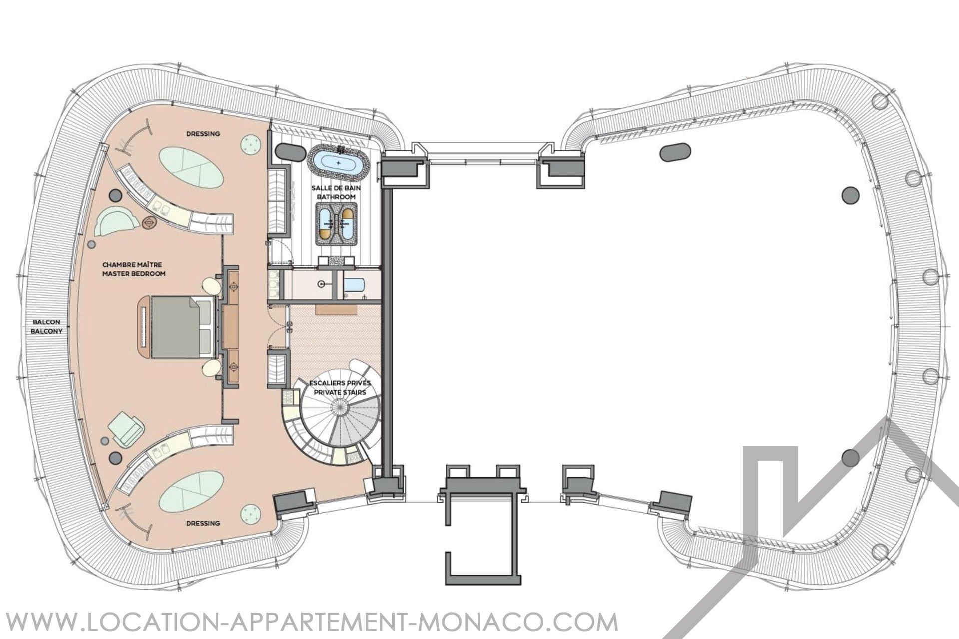 • Lower level: entirely dedicated to the master bedroom, featuring an en-suite bathroom and two walk-in dressing rooms.