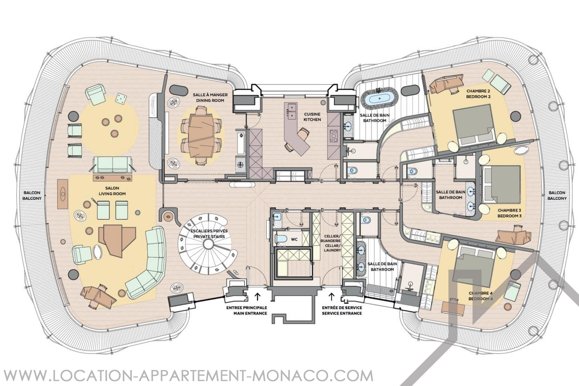 This magnificent fully furnished and decorated duplex offers 410 sqm of living space, with balconies surrounding the apartment and providing breathtaking views of the Rocher and the sea.