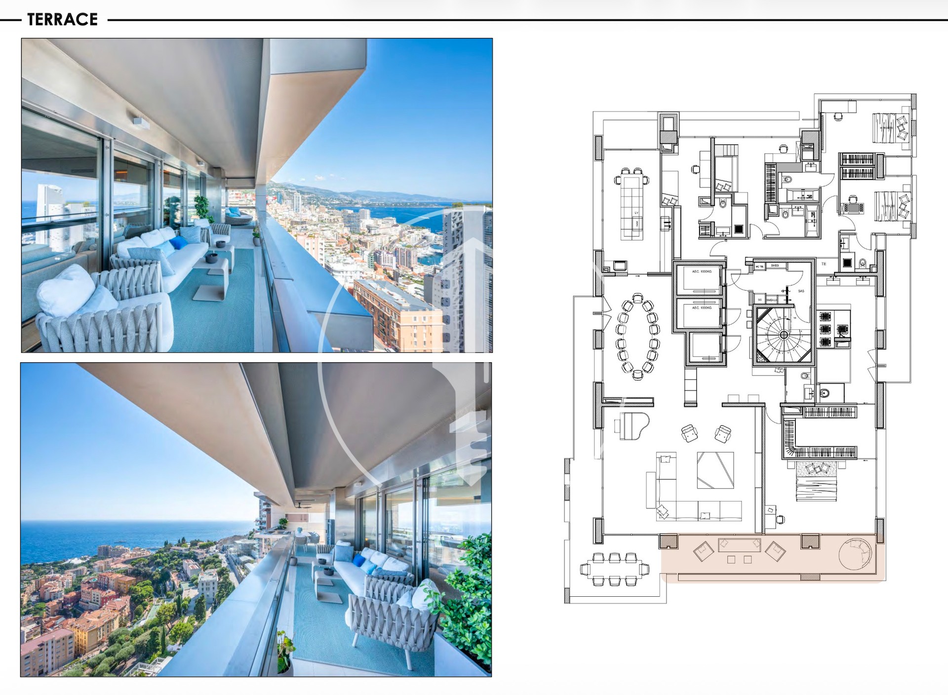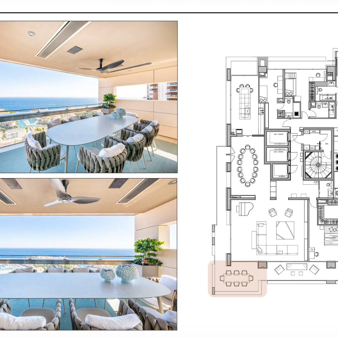 The apartment features a vast living area with its lounge opening onto a large terrace, offering a breathtaking panoramic view over the Principality, the Prince’s Palace, and the endless blue of the Mediterranean Sea.