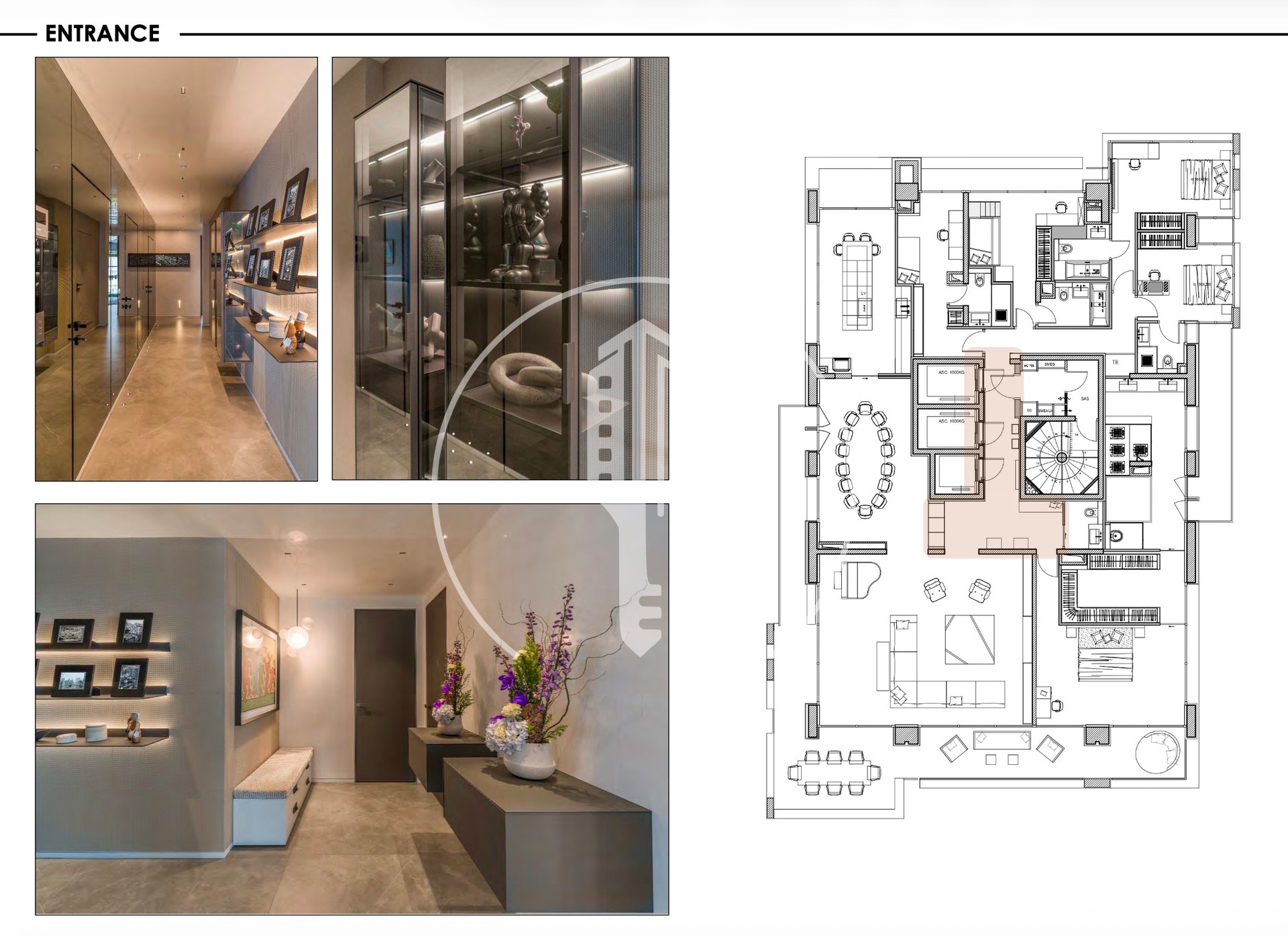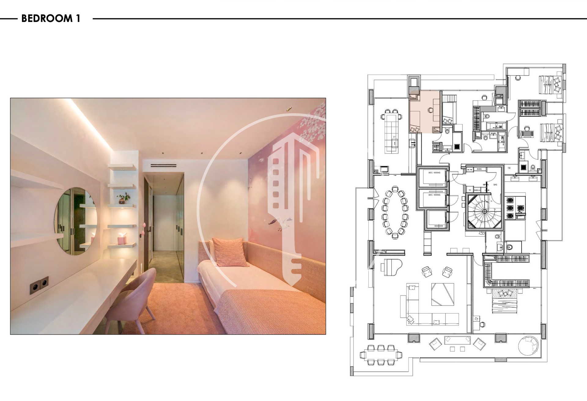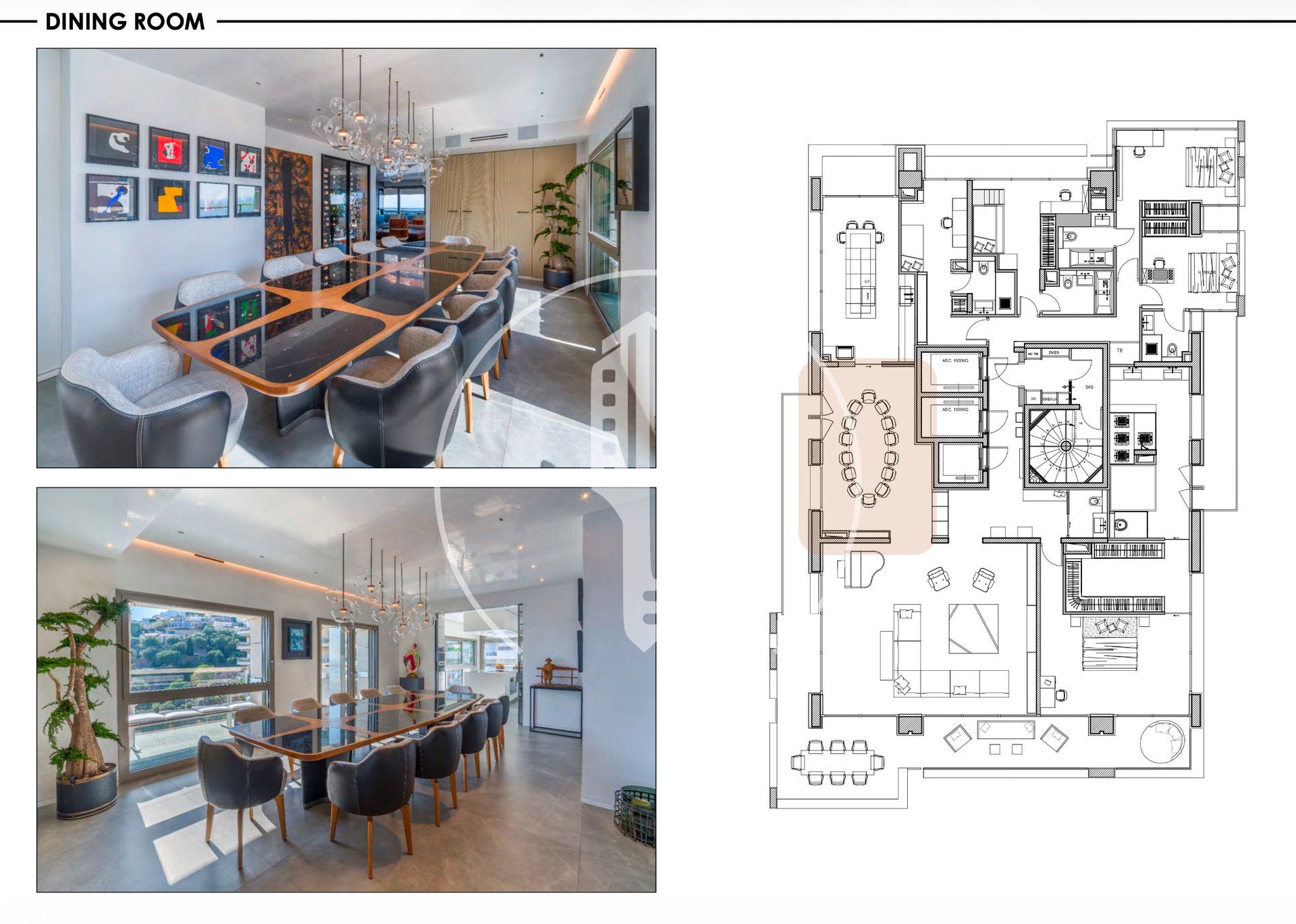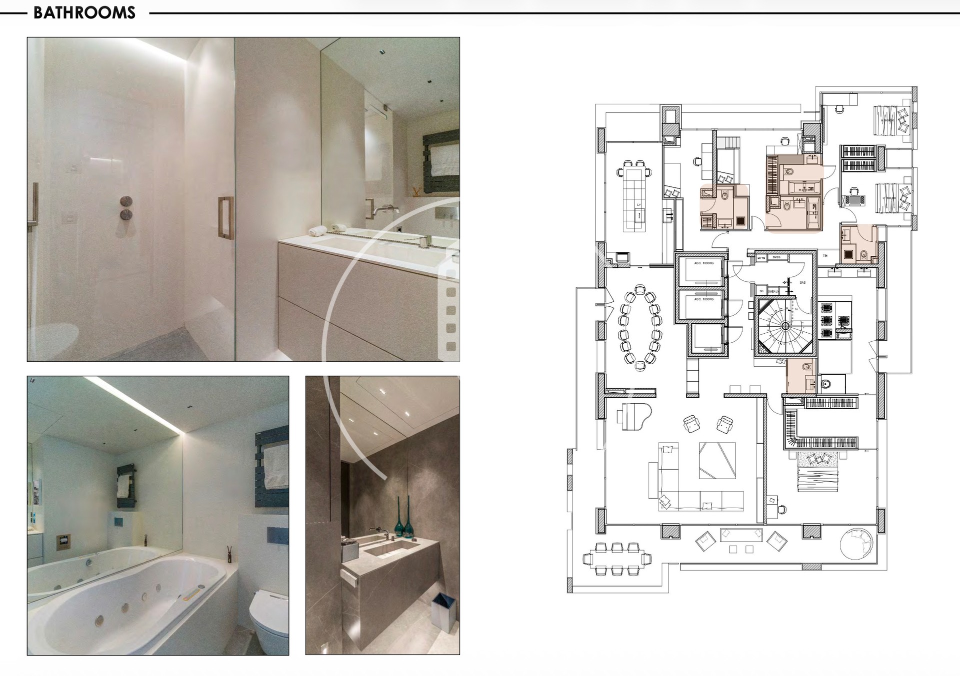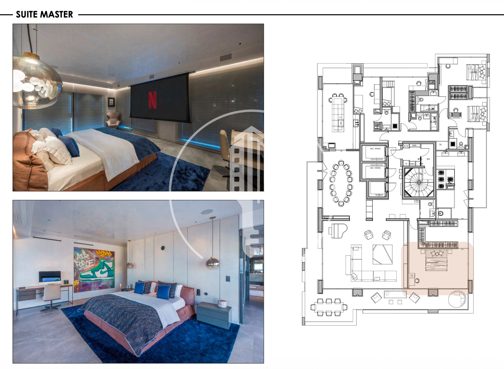 The apartment comprises 5 bedrooms, each with its own en-suite bathroom. The master bedroom opens onto a large terrace and features a home cinema, a double walk-in closet, as well as a spa area with a jacuzzi.