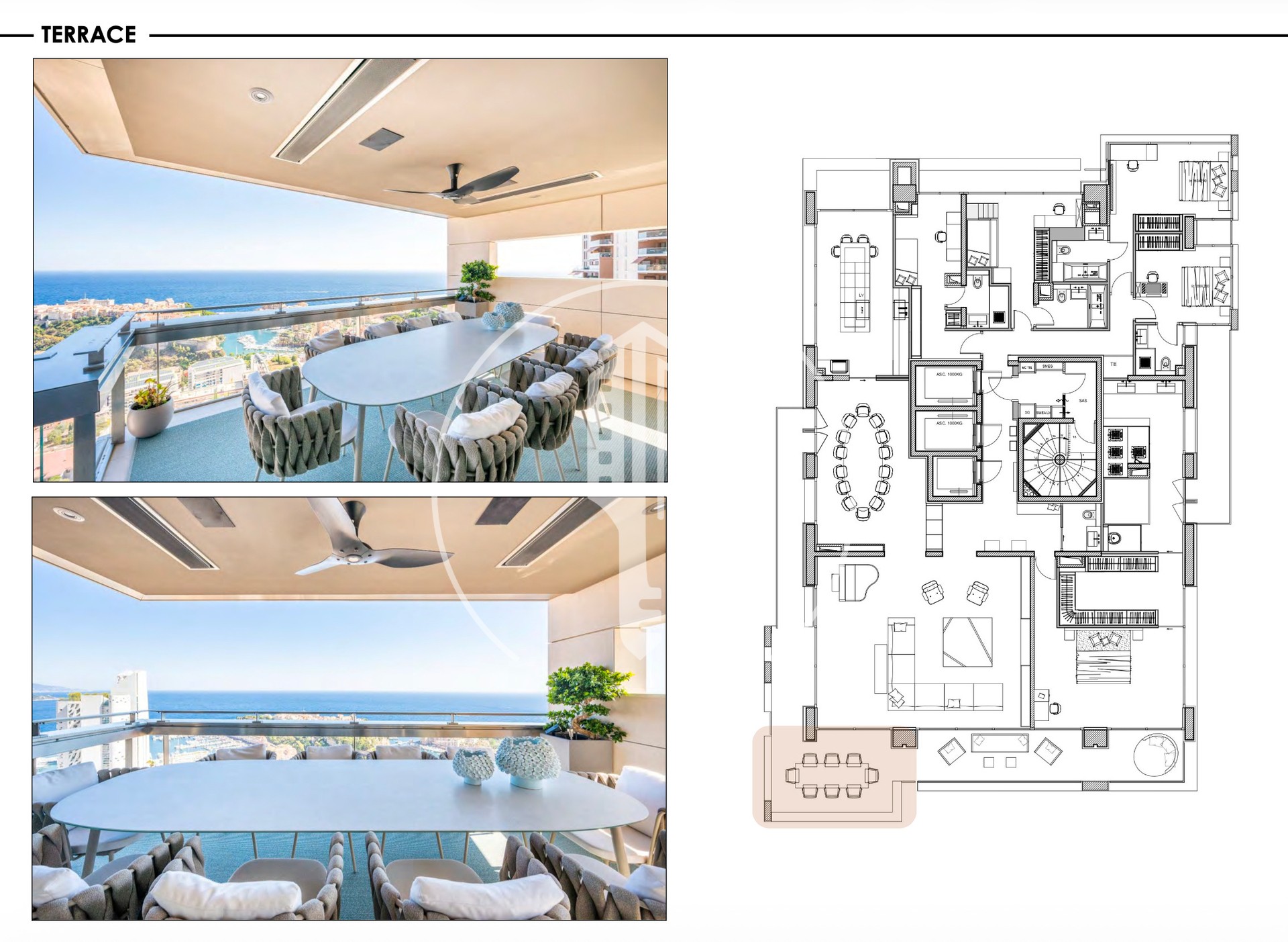 The apartment features a vast living area with its lounge opening onto a large terrace, offering a breathtaking panoramic view over the Principality, the Prince’s Palace, and the endless blue of the Mediterranean Sea.