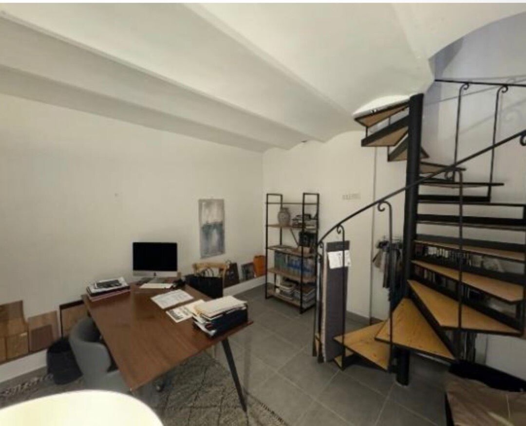 Currently rented as an office, the property features a well-organized layout including a living area, kitchen, one bedroom on the main level, and an additional lower-level space accessed via a spiral staircase, ideal as a TV room, office or storage area.