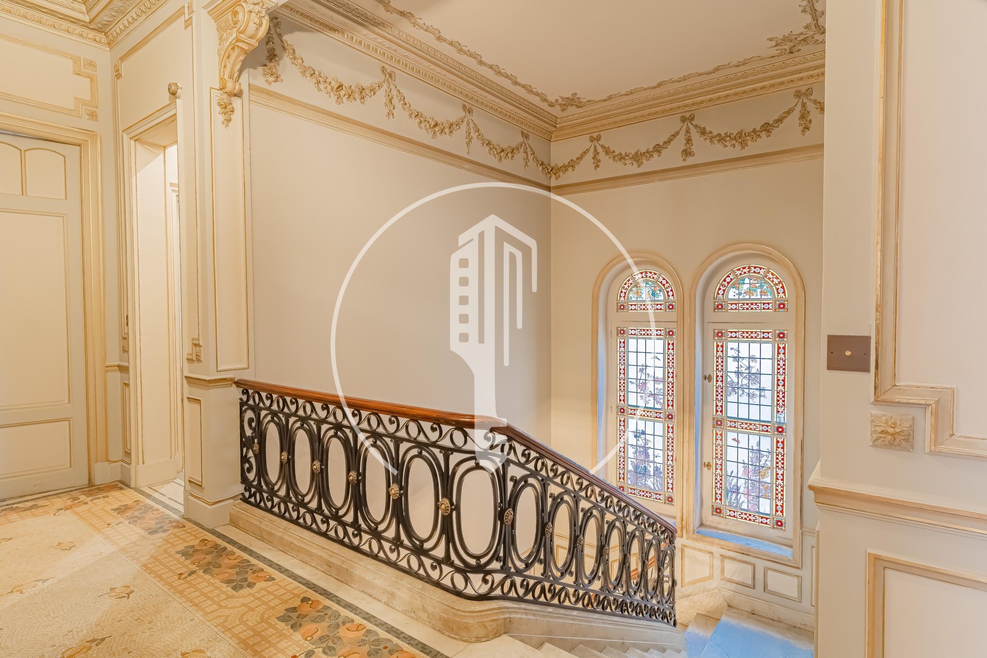 A second staircase - both grand and elegant, adorned with stained glass and a wrought-iron banister, leads to the sleeping quarters. This floor hosts a stunning master suite with 3 sets of windows, a bedroom with a marble fireplace, another double bedroom with a shower. An additional room with a mosaic, indoor basin pool completes this level.