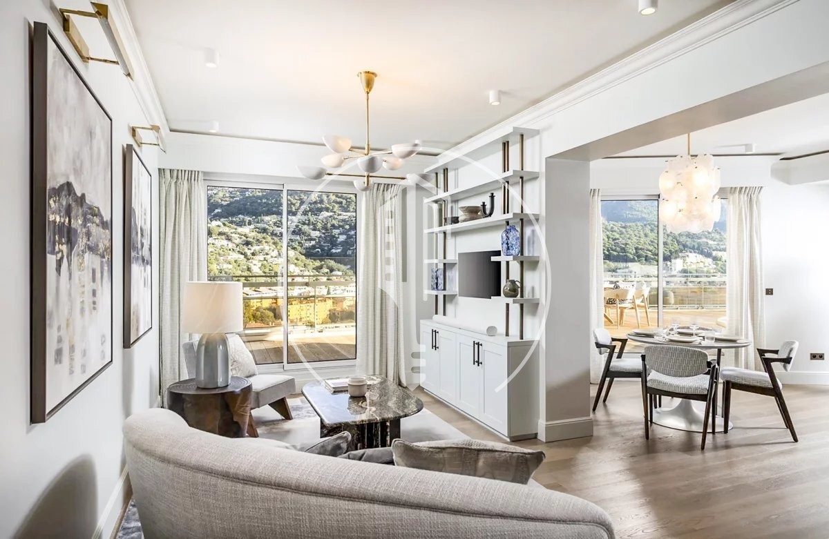 Welcome to this stunning 2-bedroom apartment, fully furnished and equipped with the highest quality materials - a true masterpiece of architecture and design. The building “Les Ligures” offers you an exclusive 24/7 concierge service, gym, an outdoor pool, extensive gardens and a tennis court. Every detail of this apartment has been planned with the utmost care by a renowned interior designer and lovingly renovated using the best materials. The entrance area welcomes you with elegance and leads you directly into the spacious living room, which blends harmoniously with a stylish study area and a modern, open kitchen. This spacious layout creates a warm and inviting atmosphere, perfect for both social evenings and relaxing moments in peace. The apartment has two exquisite bedrooms that provide cozy privacy. Both bedrooms have their own bathroom and dressing room. A true highlight of this property is the spectacular terrace, which offers you an incomparable panoramic view of glamorous Monaco. Here you can end the day with a glass of wine or enjoy the view of the sea and the city - simply magical! This apartment gives you a unique retreat in Monaco. A real gem not to be missed! A parking space and two cellars belong to this apartment.