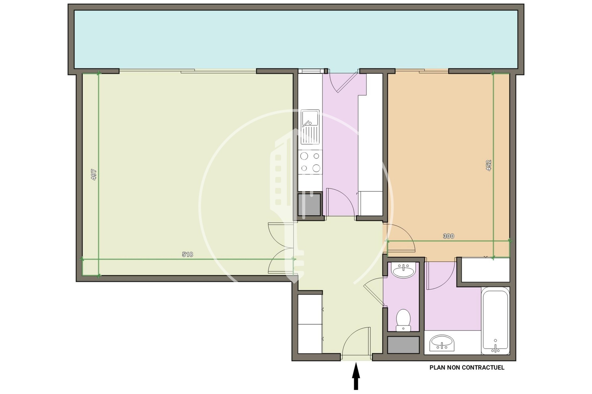 Bright and spacious, it comprises an entrance hall with built-in cupboards, a guest toilet, a large living room opening onto the terrace, a separate fitted kitchen and a bedroom with an en-suite bathroom.
